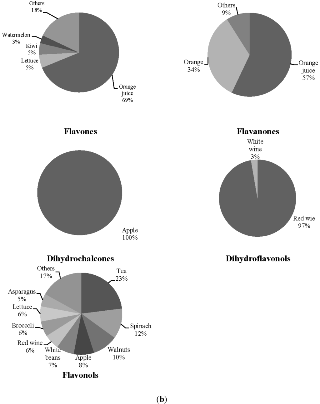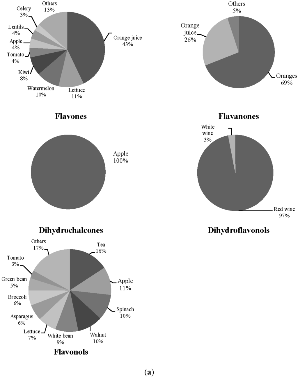 (a) Principal food sources of the flavonoid classes previously associated with fecal microbiota, in systemic lupus erythematosus patients. (b) Principal food sources of the flavonoid classes previously associated with fecal microbiota, in controls.