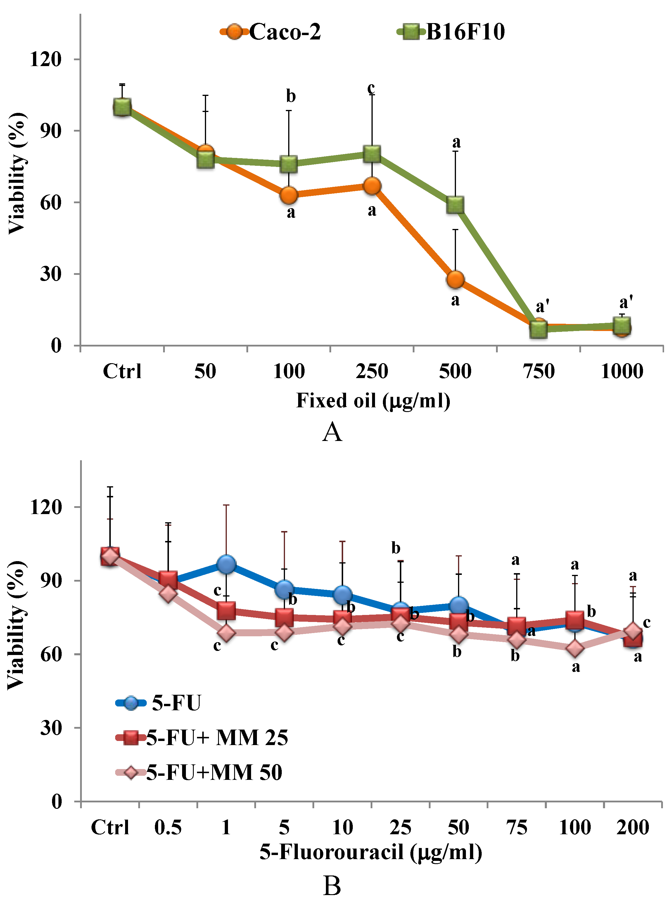 2.5. Effect of Oil on Cytotoxic Activity of 5-FU in Cancer Caco-2 Cells: MTT Assay