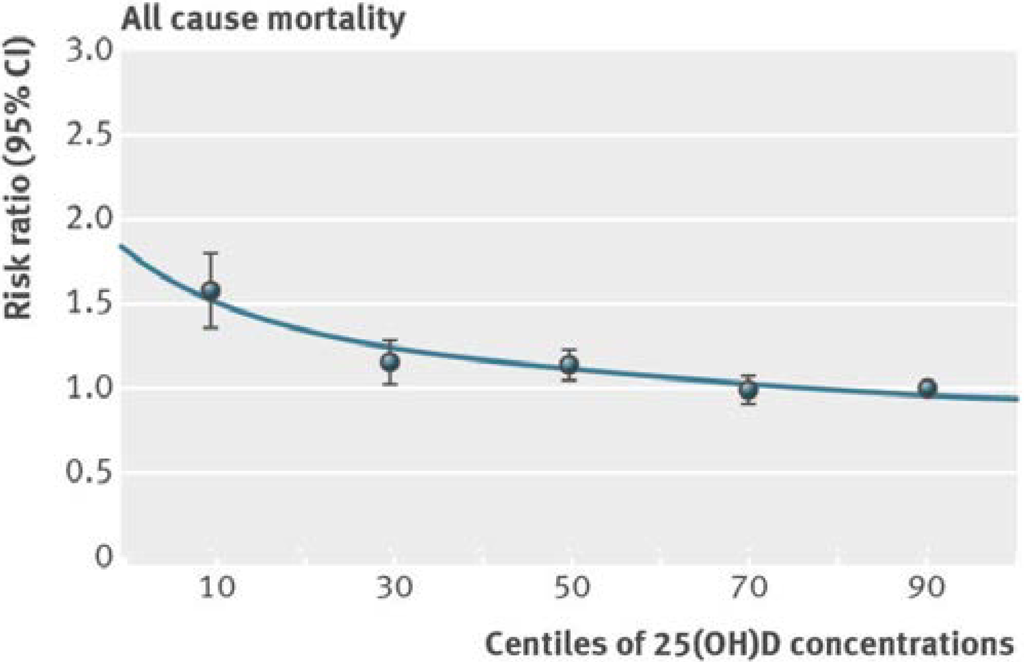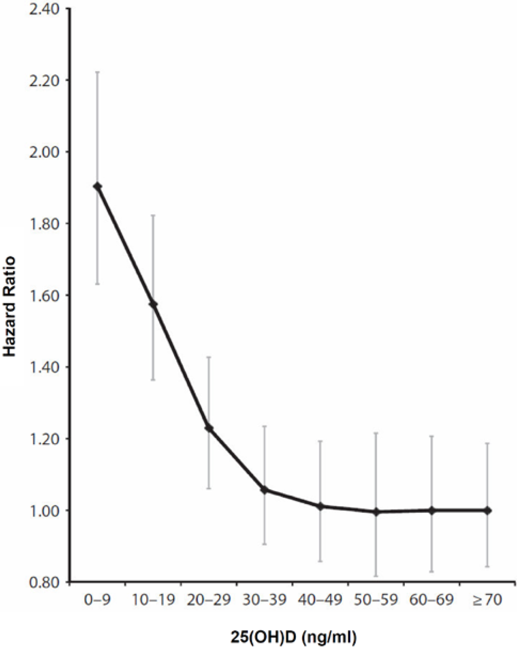 Age-adjusted hazard ratios for mortality of serum 25-hydroxyvitamin D in association with all-cause mortality (reproduced with permission) [19].