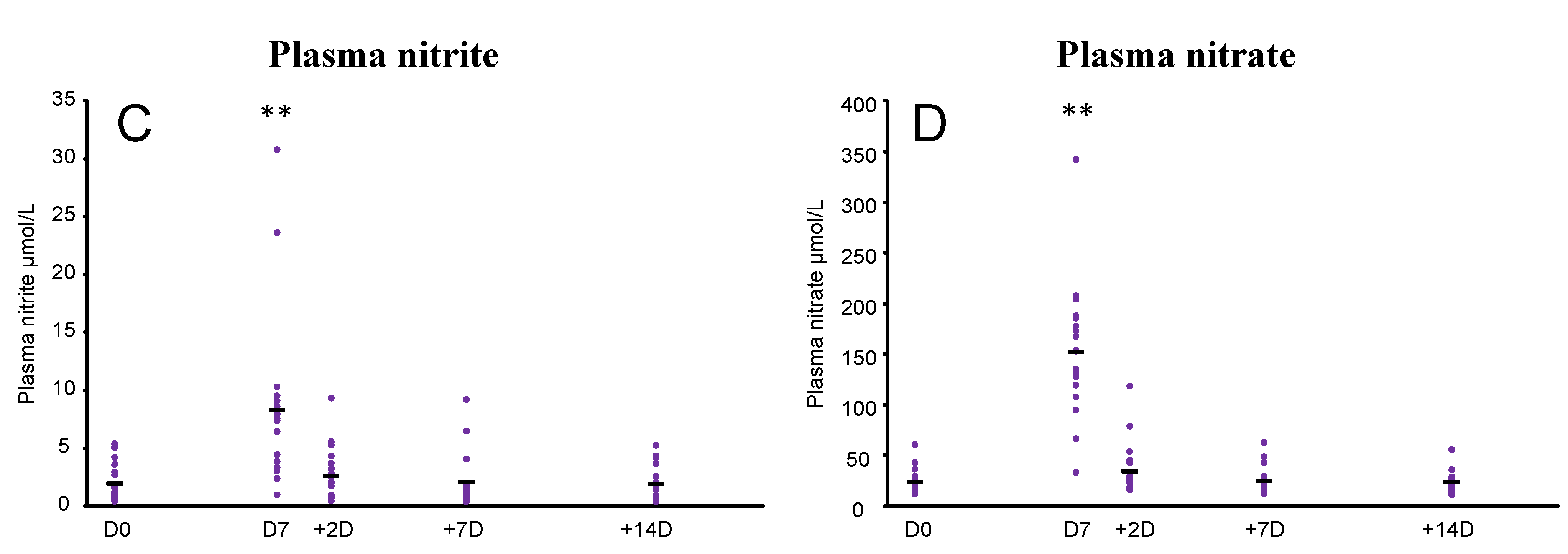 | Saliva/Plasma/Urine | Nitrate/nitrite | D0 | D7 | +2D | +7D | +14D |