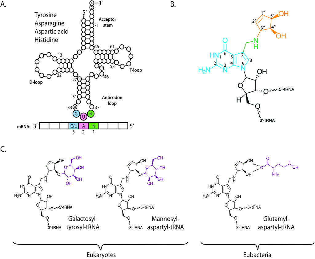 Queuosine is among the most elaborate of the known RNA modifications. It was first identified in hydroxylate extracts of tyrosyl tRNA from E. coli [5,6,7] and was given the single letter abbreviation of Q, from which the now common name of queuosine- or Q-nucleoside derives. Direct tRNA sequencing methods determined that the queuosine modification is uniquely found in the wobble position of eukaryotic and eubacterial tRNA that contain a G34U35N36 anticodon sequence (tRNAGUN; where N = any base), and thus specific to tRNA acceptors for the amino acids tyrosine, asparagine, aspartic acid and histidine (Figure 1A) [8,9] and which decode the dual synonymous codons NAU and NAC. In addition to cytosolic tRNA, the Q modification has also been detected in aspartyl tRNA from the mitochondria of rat and opossum liver by means of the 32P-postlabelling technique [10,11]. A related molecule to Q, known as archaeosine, is found at position 15 of the dihydrouridine loop (D-loop) of archael tRNA (readers with an interest in this area are directed to relevant publications [12,13,14]).