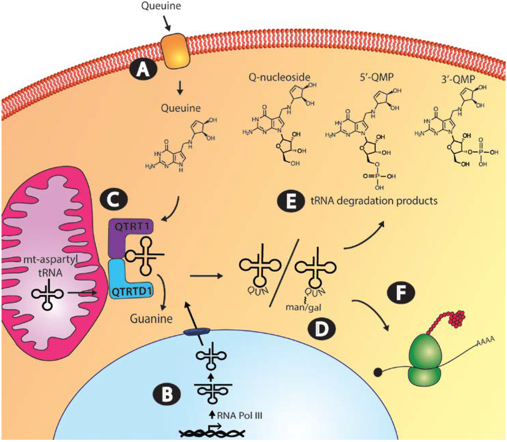 Queuine uptake, incorporation and salvage in the eukaryotic cell. (A) Transport of queuine into the cell occurs through a rapidly saturating low Km component and a slower-uptake high Km component; (B) the queuine-insertase enzyme modifies both cytosol and mitochondrial tRNA. Cytosolic tRNA is transcribed in the nucleus by RNA polymerase III, whereas mitochondrial tRNA is transcribed in the mitochondria by mitochondrial-directed RNA polymerase, before processing to the mature tRNA molecule; (C) Queuine tRNA-ribosyltransferase 1 (QTRT1) and queuine-tRNA ribosyltransferase domain containing 1 (QTRTD1) subunits of the queuine-insertase complex are cytosolic proteins that appear to co-localize to the mitochondrial membrane where queuine base is incorporated into cytosolic tyrosyl, asparaginyl, aspartyl and histidyl tRNA and mitochondrial aspartyl tRNA. (D) Cytosolic aspartyl and tyrosyl Q-modified tRNA can be further modified by the addition of mannose and galactose sugars, respectively. (E) Salvage of the queuine base from tRNA turnover could occur from queuosine nucleoside, queuosine-5′-monophosphate (5′-QMP) or queuosine-3′-monophosphate (3′-QMP). Correct functioning of uptake, incorporation and salvage of queuine base is essential to maintaining appropriate cellular Q-modified tRNA levels. (F) tRNAGUN recognize the dual synonymous codons ending in either a C or U which pairs to the wobble base.