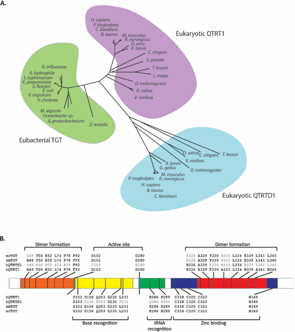 Sequence comparison of Queuine tRNA-ribosyltransferase 1 (QTRT1), queuine-tRNA ribosyltransferase domain containing 1 (QTRTD1) and eubacterial tRNA guanine transglycosylase (TGT). (A) Phylogenetic tree showing the relationship of eubacterial TGT (green shading) to eukaryotic QTRT1 (purple shading) and QTRTD1 (blue shading). Unrooted phylogenetic tree generated by comparing the protein sequences of the listed species using Genedoc. (B) Significant residues and their corresponding positions within human QTRT1 (hQTRT1), human QTRTD1 (hQTRTD1), Z. mobilis TGT (zmTGT) and E. coli TGT (ecTGT). Conserved residues are shown in black. The numbering refers to the Z. mobilis TGT sequence as described previously [61]. Shown are residues involved in dimer formation in the N-terminus (orange) and the C-terminus (red), residues involved in catalysis: active site residues (light blue), base recognition residues (yellow), tRNA recognition residues (green) and the highly conserved residues involved in zinc binding (purple).