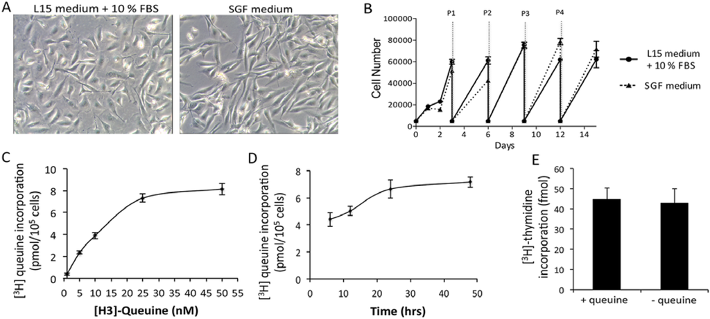 Proliferation and metabolism of queuine deficient human breast adenocarcinoma cell line, MDA-MB-231. (A) Growth of MDA-MB-231 cells in Leibovitz L15 medium (10% FBS) is indistinguishable from that in serum-free, growth factor-free medium (SGF medium). (B) Cells passaged every three days (P1, P2, etc.) on 96-well plates subject to FluoReporter® Blue Quantitation assay. Data are means ± SD (n = 8). (C) Incorporation of [3H]-queuine into MDA-MB-231 tRNA (acid-precipitable fraction) increases with concentration. Data are means ± SD (n = 4). (D) Incorporation of [3H]-queuine into MDA-MB-231 tRNA (acid-precipitable fraction) increases with time. Data are means ± SD (n = 4). (E) Incorporation of [3H] thymidine (0.4 μCi mL−1) into MDA-MB-231 DNA is unaffected by treatment with 300 nM queuine over 72 h. (F) Oxygen consumption rate (OCR) of MDA-MB-231 cells in response to metabolic modulators is unaffected by treatment with 300 nM queuine over 72 h. Metabolic modulators are: injection 1: 0.5 μg mL−1 oligomycin (ATP synthase inhibitor), injection 2:300 nM Carbonyl cyanide-4-(trifluoromethoxy) phenylhydrazone (FCCP) (electron transport chain uncoupling agent), injection 3:1 μM rotenone (electron transport chain complex I inhibitor) and 10 μM (electron transport chain complex III inhibitor). Data are means ± SD (n = 4). (G) Extracellular acidification rate (ECAR) of MDA-MB-231 cells in response to metabolic modulators is unaffected by treatment with 300 nM queuine over 72 h. Metabolic modulators are: injection 1:2.5 mM glucose (first substrate of glycolysis), injection 2: 0.5 μg mL−1 oligomycin (ATP synthase inhibitor), injection 3:25 mM 2-deoxy-d-glucose (inhibits glycolysis). Data are means ± SD (n = 4).