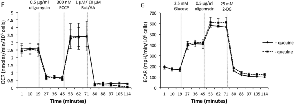 The capabilities, if any, that queuosine hypomodification may bestow to a cancer cell, are still poorly understood, and conflicting data exist. In mammalian cells, queuine treatment is reported to modulate tolerance to hypoxia [77], influence proliferation [133,134] and the expression of lactate dehydrogenase [113]. There is a question as to whether the results seen in most of these studies are due to free queuine base or Q-modified tRNA. In HeLa cells cultured in medium containing 10% horse serum, queuine treatment increased cell density under aerobic conditions but decreased cell density under hypoxic conditions [135]. From this work it is suggested that queuine is a stimulant for proliferation in an aerobic environment, but inhibitory when conditions are hypoxic. Later, a study from the same group on the proliferation of non-transformed, transformed and tumor-derived cell lines concluded that queuine can stimulate or inhibit growth, depending on the cell line investigated [134]. In HeLa cells, Kersten’s group could show that under aerobic conditions in the presence of queuine, mitochondrial electron flow was enhanced 1.4-fold, as determined by 3-(4,5-Dimethylthiazol-2-YI)-2,5-diphenyltetrazolium bromide (MTT) assay [77], indicating queuine or Q-modified tRNA may enhance oxidative phosphorylation. Our own unpublished observations failed to see any effect of queuine addition on the proliferation of HeLa, HeLaS3, HepG2, and H4IIE cells grown in commercial serum-free mediums. Furthermore, detailed analysis of the human breast adenocarcinoma cell line MDA-MB-231 grown in a chemically-defined, serum-free medium failed to show any effect of queuine on proliferation (shown by tritiated thymidine incorporation) or metabolism (determined by oxygen consumption and extracellular acidification of the medium) despite being incorporated into tRNA (Figure 5).