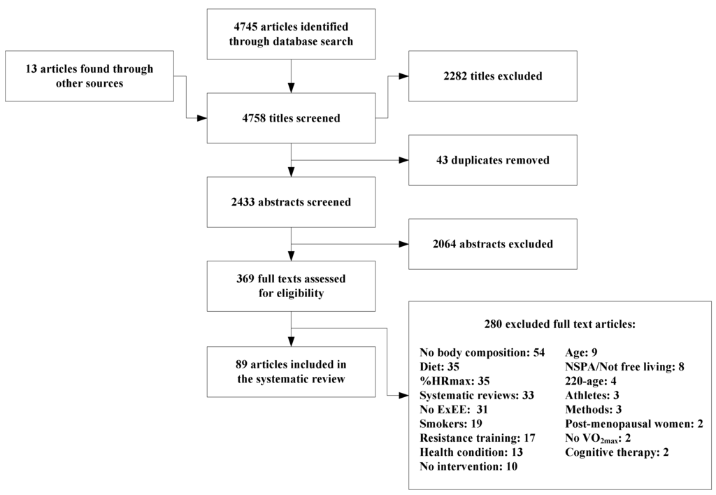 From the search protocol, 4745 articles corresponding to the specific key words and controlled vocabulary were found. In order to ensure that each of these articles met the different inclusion and exclusion criteria, a selection process was performed on a web portal by two authors (MER and SJT). The selection process was sequentially applied to all article titles, followed by the abstracts of the articles for which the title was not excluded and then to the full articles for which the abstract and the title were not excluded. Every title, abstract and article was revised independently by each author. To exclude a title/abstract/article from the set, both reviewers had to agree that it met one of the exclusion criteria (i.e., elderly, acute exercise only). Similarly, both authors had to agree that it did not meet any exclusion criteria in order to keep the article for the following phase. When the authors disagreed, the titles/abstract/article was categorized as “unsure” and kept for the following phase. At the last phase (articles screening phase), when ambiguities in the article remained (i.e., impossibility to obtain ExEE, possibility of the use of a dietary intervention), it was discussed and validated with a third party (ÉD). Finally, a database with the full articles was created using an Excel spreadsheet. The full articles were printed, and the two authors separately reviewed all of them. When both authors rejected an article, the main reason was written on the article. It was classified according to reason for exclusion in order to keep a record of the excluded articles. The reasons for rejecting articles were documented. Additional articles found from reviews and/or articles in the bibliography were also added and fully revised (n = 13). Throughout the screening process, duplicates were removed (n = 43).