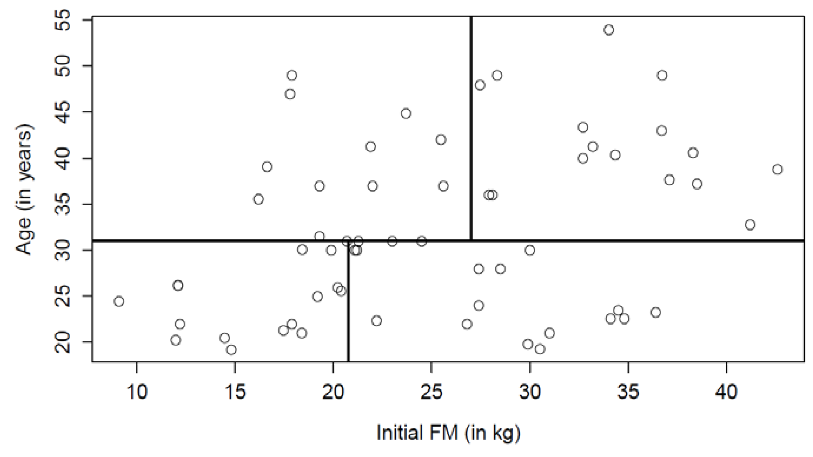 Before the construction of the model, studies that included men and women, but that did not provide independent results for each of the sexes were not included. Furthermore, studies that did not provide body composition measured with either dual-X-ray absorptiometry (DEXA), hydrostatic weighing or bod pod were excluded. Only articles with mean age or with a small range of age (i.e., [19,20,21,22,23]) were kept for further investigation. One group was discarded because the frequency was not mentioned in the article (total articles included = 40). Based on the degree of energy compensation formula, we used the inverse of the frequency, dose and duration of exercise intervention to better fit the model. To assess variance inflation due to the multicollinearity of the predictors, we used linear regressions to examine the association between the continuous predictors. Since initial FM and BMI were strongly associated (R-squared = 0.89; p < 0.0001), initial BMI was not further used in the model. This decision was mostly based on the fact that several missing data were noted for this variable and because FM is a more accurate measure of adiposity. Since the inclusion of second order terms, such as interaction terms and quadratic terms, in the model can cause variance inflation due to multicollinearity, continuous predictors to include second order terms were standardized [29].