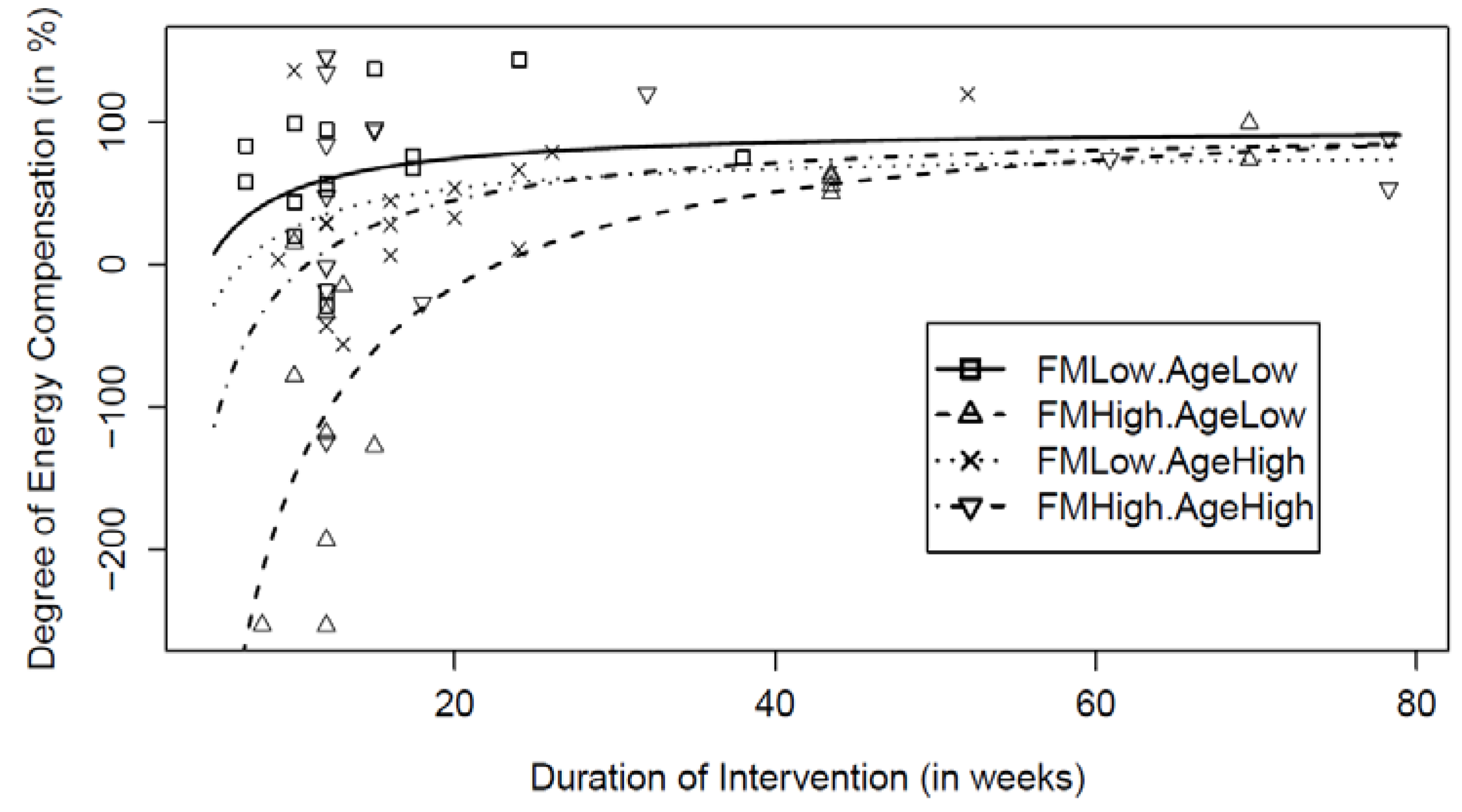 The model was initially fit with a weighted least squares using the number of participants in the study as the weight. The fit of the model was visually assessed with a Q-Q plot and a residual plot of the weighted residuals. In the model with no interactions, only inverse length (p < 0.0001) and initial FM (p < 0.05) were significant. There was a trend for age. As we included the interactions for these predictors in the model, the interactions were significant. Intervention duration (F(3,50) = 14.66; p < 0.0001), age (F(3,50) = 6.65; p < 0.0007) and initial FM (F(3,50) = 8.73; p < 0.0001) were significant. Neither sex (F(1,50) = 0.42; p = 0.52), nor frequency (F(1,50) = 0.10; p = 0.76), nor dose (F(1,50) = 0.214; p = 0.64), nor intensity F(1,50) = 0.43; p = 0.51) were significant; thus, they were dropped from the model. The reduced interaction model was fitted with a weighted least squares and was highly significant (F(6,54) = 10.18; p < 0.0001). In order to determine significant differences, post hoc test analyses were performed using general linear tests.