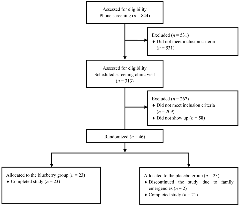 A six-week randomized, double-blind, placebo-controlled and parallel-arm human dietary intervention trial was conducted at Pennington Biomedical Research Center (Baton Rouge, LA, USA). Recruitment began in July 2010 and continued until June 2012, when the final participant was finished. The study was approved by Pennington Biomedical Research Center’s Institutional Review Board for human subjects (Approval Number 10014) and registered at the United States National Institutes of Health (clinicaltrials.gov; NCT01399138). Participants who met the inclusion criteria were randomized to either the blueberry or matched placebo group and required to visit the clinic weekly over six weeks. Allocation to either the treatment or placebo group was based on a randomization table created by the study biostatistician, and block randomization was used with random functions in SAS 9.3 to ensure well-balanced groups. After the table was generated, the kitchen staff randomized the participants to the treatment or placebo group. The participants and treatment or placebo smoothie were identified only by code numbers. The trial investigators and participants remained blinded until after the study was completed and data analysis was performed.