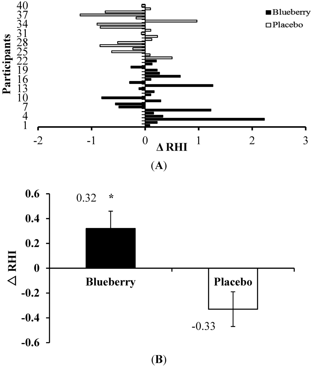 (A) Change in RHI (Δ; post- minus pre-intervention) in individual humans with metabolic syndrome who consumed the blueberry or placebo smoothie for six weeks; (B) mean change in RHI after adjusting for percentage of body fat and gender. * p = 0.0023 between groups (blueberry versus placebo). RHI, reactive hyperemia index (i.e., endothelial function). Values are the means ± SEM, n = 22 (blueberry) or n = 18 (placebo).