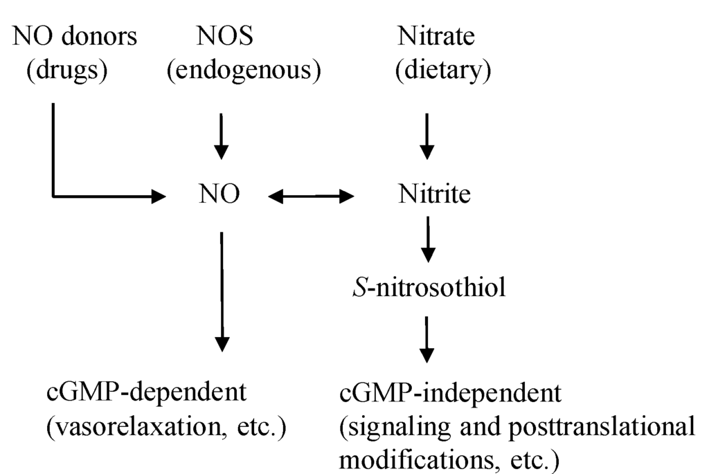 Bryan et al., also showed that the increase in plasma nitrite within the physiological concentration rage of 0.2–2 μM after nitrite administration (plasma concentration of nitrite far lower than those required for vasodilation) enhanced S-nitrosothiol in the organs (heart, kidney, liver, lung, and aorta) with the subsequent modulation of signaling and gene expressions of cGMP, cytochrome P-450, heat shock protein 70, and heme oxygenase-1 in these organs. Interestingly, they also showed that a switch of the standard chow to the low nitrate/nitrite diet for two days in rats decreased nitrite levels substantially in all tissues and represented changes of the signaling and gene expressions in a direction opposite to those found with nitrite administration [10].