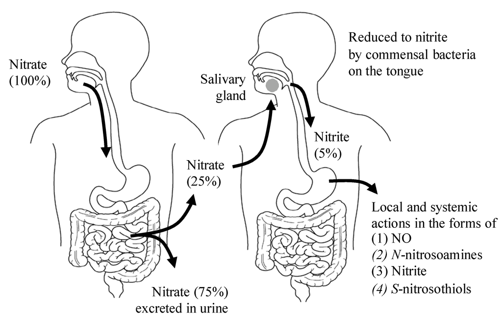 Very high concentrations of nitrate in drinking water may cause methemoglobinemia in infants (blue baby syndrome) [41]. In the 1940s, Comly first reported cases of cyanotic infants who received formula prepared with well water containing a high nitrate content [42]. Based on the subsequent analyses of the infantile cases of methemoglobinemia, the US Environmental Protection Agency (EPA) set a Maximum Contaminant Level (MCL) for nitrate of 44 mg/L (equal to 10 mg/L nitrogen in nitrate). However, it is now thought that methemoglobinemia per se was not caused by nitrate itself, but by fecal bacteria that infected infants and produced NO in their gut. A recent report by Avery has argued that it is unlikely that nitrate causes methemoglobinemia without bacterial contamination, and also that the 40–50 mg/L limit on nitrate in drinking water is not necessary [43]. However, there are now legal limits to the concentrations of nitrate and nitrite in both food and drinking water. The WHO showed that the Acceptable Daily Intake for humans (ADI) for nitrate and nitrite were 3.7 and 0.07 mg/kg body weight/day, respectively, which were based on the calculations from the doses of <500 mg of sodium nitrate/kg body weight that were harmless to rats and dogs. The international estimates of nitrate intake from food are 31–185 mg/day in Europe and 40–100 mg/day in the United States [44,45]. However, the Ministry of Health, Labour and Welfare of Japan reported that the average intake of nitrate in the Japanese populations is around 200–300 mg/day, which is one and a half times to two times the ADI. Furthermore, according to a report by Hord [28], in which the daily nitrate and nitrite intakes were calculated based on the variations using the vegetable and fruit components of the DASH (Dietary Approaches to Stop Hypertension) dietary pattern [46], the level easily exceeds 1,200 mg/day nitrate. This is more than five-fold higher than the WHO’s ADI of 3.7 mg nitrate/kg body weight/day, and more than two-fold the US Environmental Protection Agency’s level of 7.0 mg nitrate/kg body weight/day for a 60 kg individual [28]. Furthermore, as indicated in Figure 2, approximately 25% of the ingested nitrate is secreted in saliva, and 20% of the secreted nitrate in saliva is converted to nitrite by commensal bacteria on the tongue [22], indicating that about 5% of the originally ingested nitrate is swallowed into the stomach (Figure 1). Therefore, for a DASH diet containing 1200 mg nitrate, an individual would be expected to swallow approximately 45 mg of nitrite a day, which easily exceeds the ADI of nitrite. Therefore, a comprehensive reevaluation of the health effects of dietary sources of nitrate/nitrite might be required in the near future [28]. Another major health concern regarding dietary nitrate/nitrite is whether dietary nitrate can cause cancer. In fact, nitrate and nitrite themselves are not carcinogenic, but nitrite which is formed from dietary nitrate might react with dietary amines to form carcinogenic nitrosoamines. This phenomenon will be discussed in detail below.