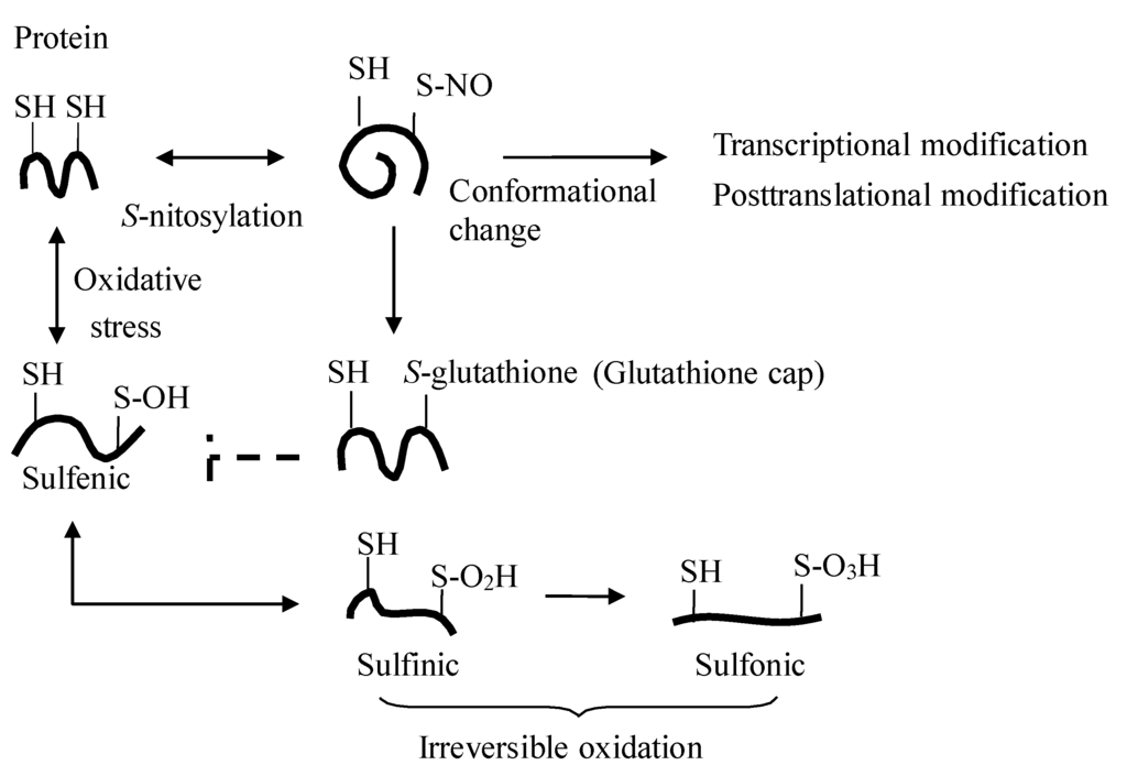Protein S-nitrosylation. S-nitrosylation of protein elicits its regulatory effect by adding the NO moiety on the active thiol (SH of cysteine residue) of the protein (e.g., transcriptional factors and enzymes), and cell protection by the subsequent posttranslational addition of glutathione to the protein thiols (so-called glutathione cap), which shields the cysteine residues from further irreversible protein oxidation [11].