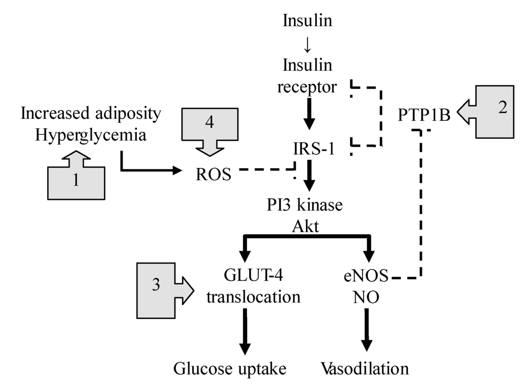 The NO-mediated actions on insulin signaling pathway. The boxes with arrows indicate the sites of NO-mediated actions against insulin resistance. Dotted lines represent inhibition, and solid lines represent stimulation. (1) NO suppresses TLR4-mediated inflammation and ROS production; (2) NO enhances the effects of insulin through the S-nitrosylation-mediated inhibition of phosphatase activity of PTPB1; (3) NO-dependent nitrosylation of GLUT4 facilitates glucose uptake; (4) NO inhibits mitochondrial ROS production through S-nitrosylation of the mitochondrial respiratory chain complex. IRS-1: insulin receptor substrate-1, ROS: reactive oxygen species, NO: nitric oxide, eNOS: endothelial NO synthase, GLUT4: glucose transporter 4, PI3 kinase: phosphatidylinositol 3-kinase, PTPB1: protein-tyrosine phosphatase B1, TLR4: toll like receptor 4.