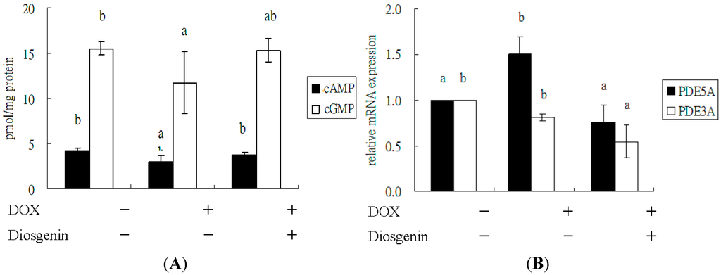 Effect of diosgenin on levels of cAMP and cGMP (A), and mRNA expressions of PDE5A and PDE3A (B) in heart tissues of mice treated with DOX for four weeks. Values are mean ± SD, n = 10. a,b Means in a row without a common letter differ, p < 0.05.