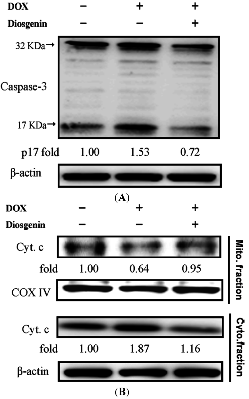 A major adverse side effect associated with DOX use in the clinic is the occurrence of cardiomyopathy and heart failure. Therefore, several reports suggest that the DOX-induced apoptosis plays an important role in cardiotoxicity that is linked to the formation of ROS [46]. ROS production or oxidative stress promotes apoptosis, necrosis and autophagy in cardiomyocytes [47]. Caspase-3 activity can also be influenced by DOX [11]. Antioxidant enzymes form the first line of defense against cardiac tissue damage, and an increased oxidative stress may be due to depletion of antioxidants as reported earlier [36]. In the present study, the DOX-treated group showed an increase in active caspase-3 expression, indicating enhance effect of caspase-3 activity in apoptosis (Figure 2A). After treatment with diosgenin, we observed a significant decrease in the cleavage of caspase-3 (Figure 2A), which is consistent with previous investigations [7,9].