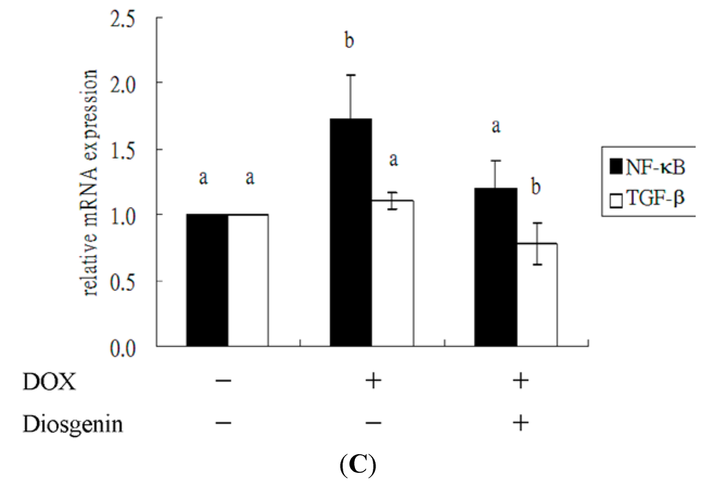 3.4. Diosgenin Weakened DOX-Induced Caspase-3 Activation and NF-κB Expression