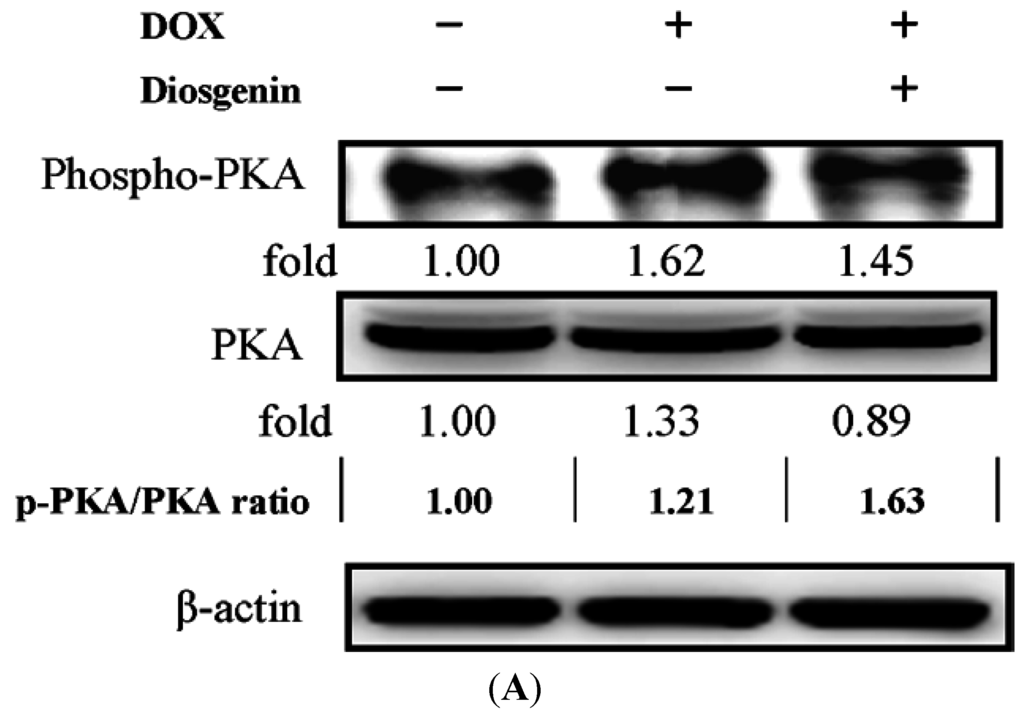 3.5. Diosgenin Restored DOX-Regulated PKA and p38 Activation