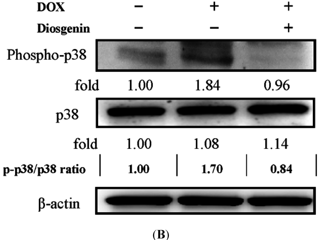Many previous studies revealed that MAPKs play a crucial role in the development of hypertrophy processes such as inflammation and fibrosis, and p38 MAPK can act as a therapeutic target [34,56]. It has also been reported that DOX can promote cardiac oxidative, inflammatory and apoptotic reactions via activation of both NF-κB and MAPK pathways in the heart [57,58]. Our present study showed that diosgenin declined the mRNA level of NF-κB (Figure 2C) and down-regulated the expression of p-p38 (Figure 3B). Pharmacological inhibition of p38 MAPK protects cardiac myocytes from apoptosis during simulated I/R in vitro, indicating that p38 MAPK functions as a pro-apoptotic signaling effector [59]. It is therefore possible that the inhibitory effect of diosgenin on the DOX-induced cardiotoxicity was conducted via inactivating p38 that subsequently led to a reduction in the apoptotic signaling. However, their relevance needs to be demonstrated.