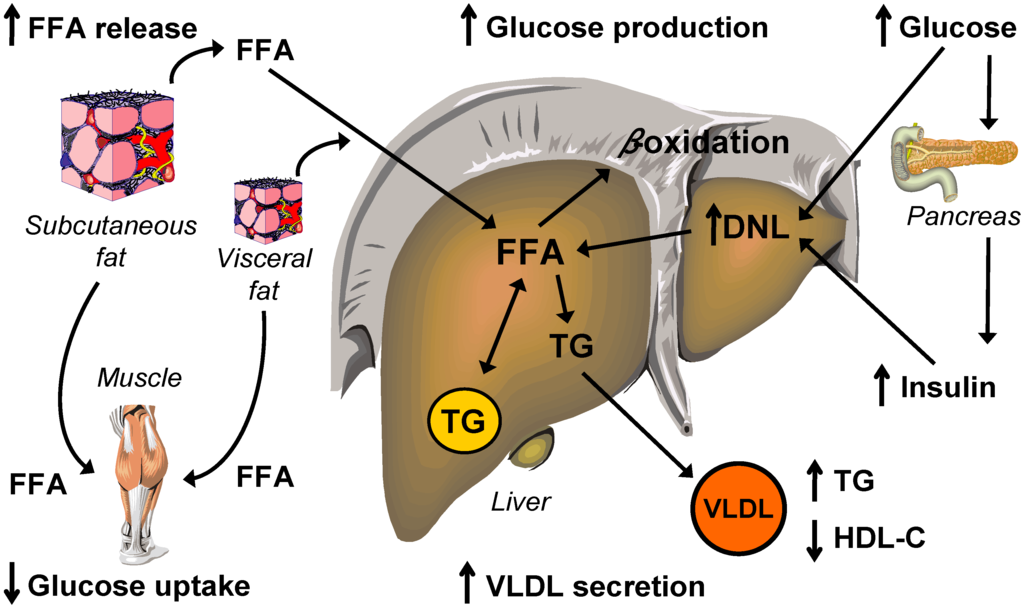 Mechanisms of metabolic dysfunction in NAFLD. Nonalcoholic fatty liver disease (NAFLD) is associated with increased release of free fatty acids (FFA) from adipose tissue, because of enlarged fat stores and the inability of insulin to down-regulate lipolysis (i.e., adipose tissue insulin resistance); systemic plasma FFA are subsequently taken up by the liver at increased rates. Intrahepatic fatty acid availability is further augmented by increased hepatic de novo lipogenesis (DNL). Increased availability of fatty acids in the liver results in accumulation of intrahepatic triglyceride (TG) and steatosis, oversecretion of very low density lipoprotein (VLDL) TG and various form of dyslipidemia, and increased glucose production (i.e., hepatic insulin resistance). Increased availability of fatty acids in muscle results in decreased glucose uptake (i.e., skeletal muscle insulin resistance). The net result of increased glucose production and decreased glucose uptake is an increase in plasma glucose concentration (hyperglycemia), which stimulates the pancreas to secrete more insulin, to compensate for the impaired insulin action. Hyperglycemia and hyperinsulinemia further augment hepatic de novo lipogenesis.