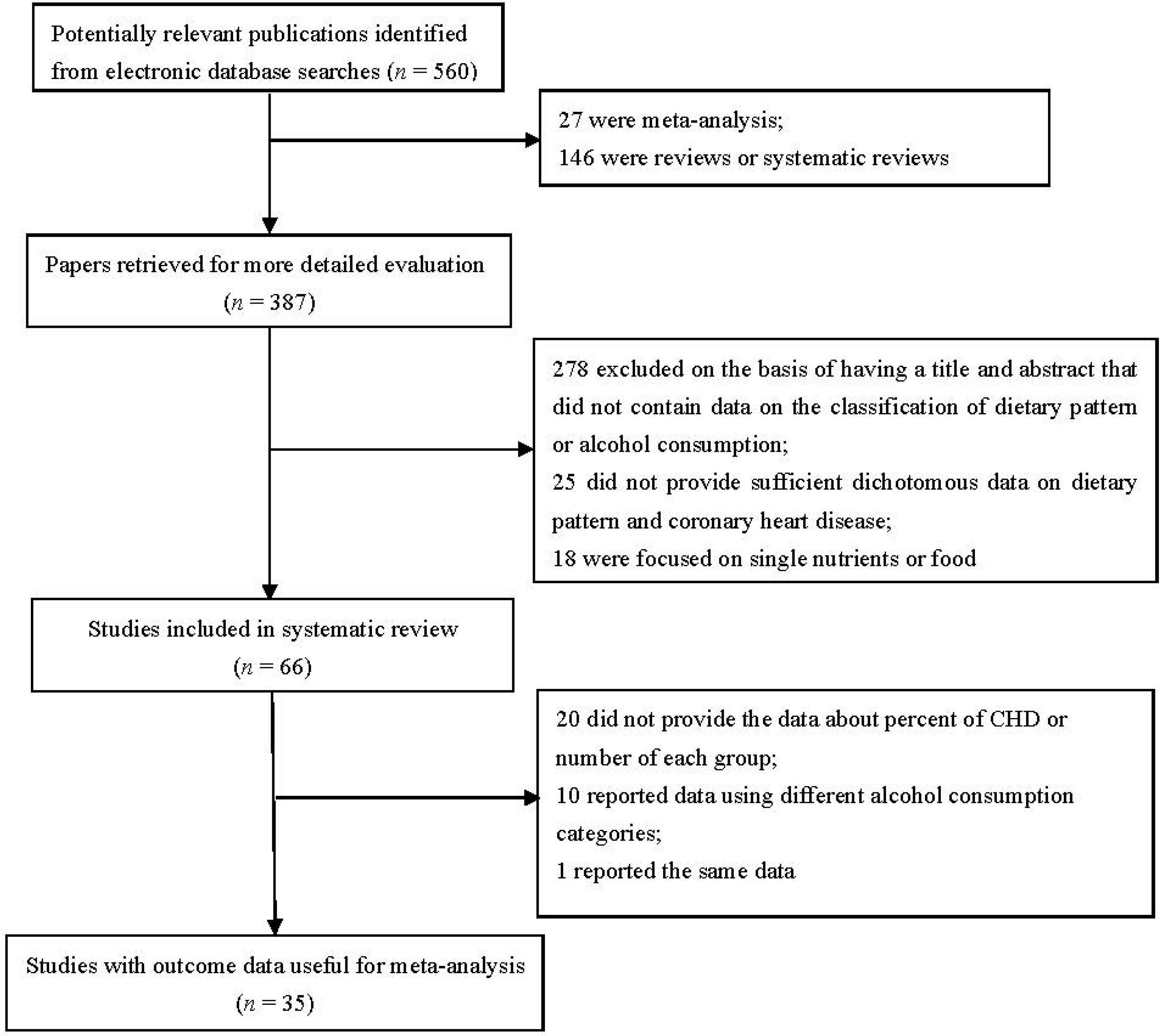 Two independent reviewers (L. Shu and X.-Y. Zhang) read the abstracts of the papers retrieved in the initial search to identify studies that examined the associations between dietary patterns and the risk of CHD. When all reviewers agreed, the papers were reviewed against inclusion and exclusion criteria for this meta-analysis. To be eligible, dietary pattern studies had to fulfill the following criteria: (1) The study was published as an original article reporting the relationship of different dietary patterns and the risk of CHD. (2) Food or dietary patterns in studies were examined by principal component analysis (PCA) and/or factor analysis (FA). (3) Odds ratios or hazard ratios, and percentage for CHD (or data can be calculated) had been provided. (4) CHD was diagnosed based on clinical manifestations (including myocardial infarction or angina, or myocardial ischemia, or cardiac failure and arrhythmia, or a death certificate cause of death as CHD), electrocardiogram, and coronary aeteriography. Alcohol studies were included in this meta-analysis if they met the following criteria: (1) the study was published as an original article; (2) the association between alcohol intake and risk of CHD had been reported in studies; (3) the different alcohol consumption categories have been described in studies; and (4) CHD was diagnosed based on clinical manifestations, electrocardiogram, and coronary arteriography.