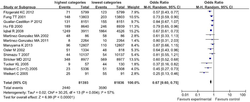The healthy/prudent dietary patterns were characterized by high consumption of vegetables, fruits, whole grains, olive oil, fish, soy, poultry and low fat dairy. The examined studies labeled it as “Prudent” [8,11,13,15,23], “Simplified food” [16], “Low SF and high FV” [18], “Dietary pattern 1” [19], “DASH” [20], “Mediterranean” [21,28,29], “Vegetable and fruit” [22], and “Japanese pattern” [30]. Figure 2 showed an obvious evidence of a decreased risk of CHD in the highest compared with the lowest categories of “healthy/prudent dietary patterns (OR = 0.67; CI: 0.60, 0.75; p < 0.00001). A random-effects model was used to assess the data included in our analyses. The heterogeneity was apparent in all the studies (p = 0.004; I2 = 57%).