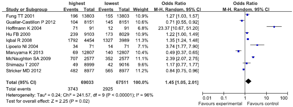 The unhealthy/Western-type dietary patterns were characterized by high consumption of red and/or processed meat, refined grains, sweets, high-fat dairy products, butter, potatoes and high-fat gravy, and low intakes of fruits and vegetables. The studies under consideration labeled it as “Western” [8,9,13,14,15,23,28], “Animal foods” [17,22,30] and “Dietary pattern 2” [19]. The association between unhealthy/Western-type dietary patterns and the risk of CHD was shown in Figure 3. There was evidence of an increased risk of CHD in the highest compared with the lowest categories of unhealthy/Western-type dietary patterns (OR = 1.45; CI: 1.05, 2.01; p = 0.02) where all studies were combined in the random-effects model. There was significant heterogeneity (I2 = 96%, p < 0.00001).