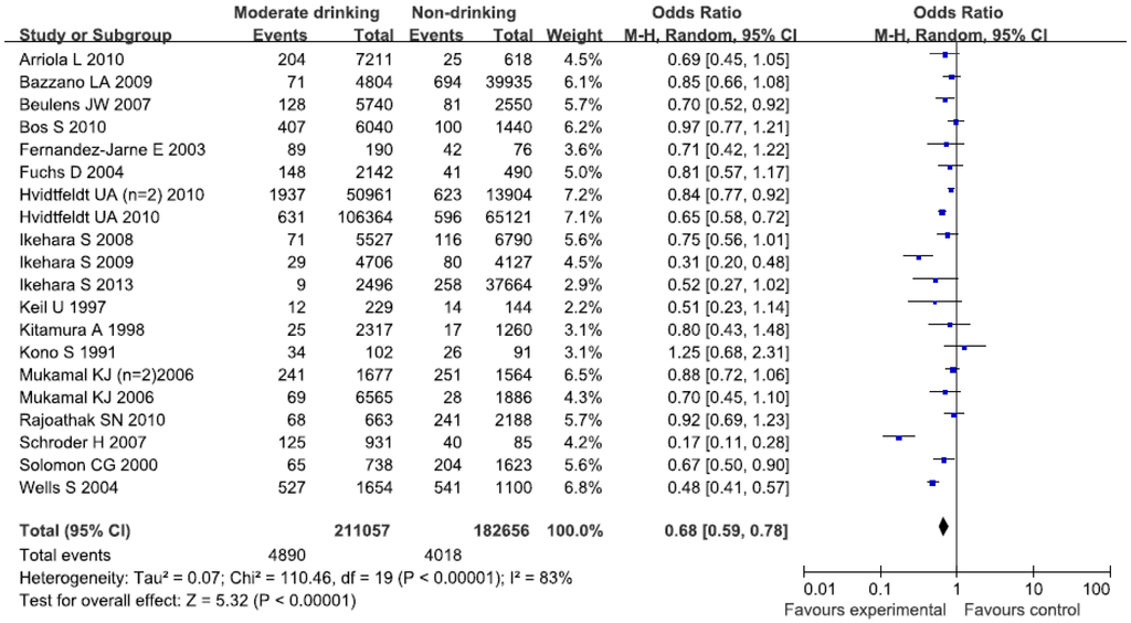 The alcohol consumption was characterized by moderate intakes of wines, alcohol-containing beers, and white spirits. Nineteen studies (reporting twenty original studies) have identified moderate alcohol consumption. The data from nineteen studies were assessed using the random-effects model, and there was significant heterogeneity (I2 = 83%, p < 0.00001). Figure 4 showed an obvious evidence of a decreased risk of CHD in the moderate drinking compared with non-drinking category intake of the alcohol consumption levels (OR = 0.68; 95% CI: 0.59, 0.78; p < 0.00001).