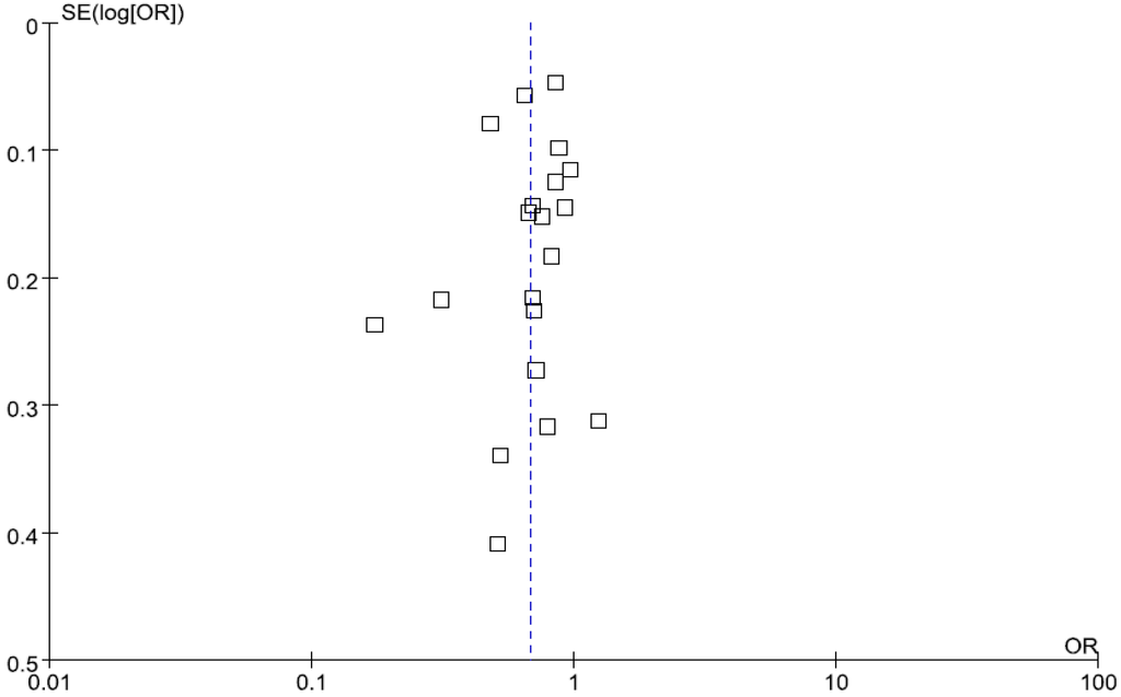 When the results were analyzed by removing non-American and non-European studies [17,22,30,36,37,38,41,44,47], the difference in the risk of CHD was shown in Western-type dietary pattern and alcohol consumption (Western-type: OR = 1.53; 95% CI: 1.05, 2.22; p < 0.01; alcohol consumption: OR = 0.68; 95% CI :0.51, 0.80; p < 0.05). When sample size <10,000 was removed [8,14,16,17,18,19,29,34,40,41,42,43,44,45,46], the difference in the risk of CHD was shown in Western-type dietary pattern (OR = 1.77; 95% CI: 1.08, 2.28; p < 0.01). Similarly, when the results were analyzed by removing the studies adjusted for total energy intake [16,17,18,20,21,22,23,28,30,31,32,34,39], the difference in the risk of CHD for those in the highest category compared with the lowest categories of Western-type dietary pattern was detected. Moreover, when the results were analyzed by removing the studies adjusted for sex, no difference in the risk of CHD was found. Finally, when the results were analyzed by removing case-control studies, the difference in the risk of CHD was shown in alcohol consumption (OR = 0.74; 95% CI: 0.66, 0.83; p < 0.01). As these variables have a strong effect on association between different dietary patterns and risk of CHD, their differences may partially explain the observed heterogeneity between studies (Table B2).