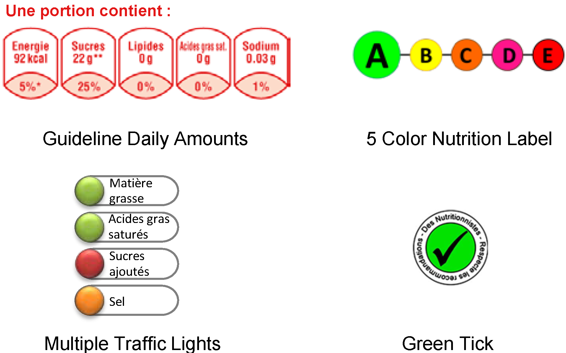 - Guideline Daily Amounts (GDA): this label indicates the kilocalories and the amount of total fat, saturated fatty acids, sugars, and sodium in grams per portion, as well as the corresponding contribution (in percentages) to the guideline-based daily intakes of these nutrients [10]. This label can be found on most food packaging on the French market, following a voluntary initiative on part of manufacturers. The GDA information was calculated by using the Food and Drink Federation’s guiding principles and was based on the average nutrient requirements for an adult woman.