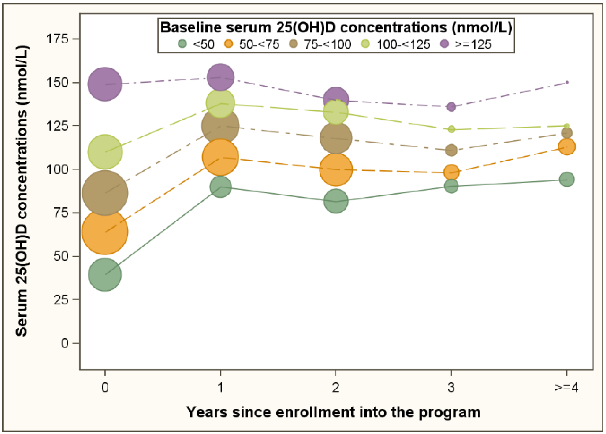 Serum 25(OH)D concentrations of program participants during follow up and grouped by baseline 25(OH)D concentrations. 25(OH)D, 25-hydroxyvitamin D; the sizes of the bubbles are proportional to the numbers of participants.