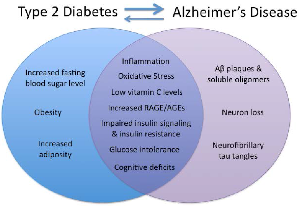 The specific goals of this review are to discuss the shared characteristics and pathology of AD and T2DM, explain some of the possible pathological mechanisms that can contribute to cognitive dysfunction in both diseases (i.e., insulin resistance and impaired signaling, inflammation), and in light of these points, discuss potential novel treatment targets and interventions that could prove useful in improving cognition and quality of life for those suffering from AD.