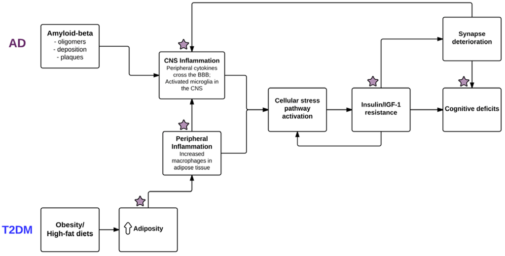 Shared pathological mechanisms of Alzheimer’s disease (AD) and type 2 diabetes mellitus (T2DM). Among the shared pathological mechanisms between the two disease states are inflammatory processes including the release of pro-inflammatory cytokines (some of which can cross the blood-brain barrier (BBB)), e.g., tumor necrosis factor alpha (TNF-α): from microglia in the central nervous system (CNS) in AD, and from macrophages in the periphery in T2DM. In turn, these processes activate cellular stress pathways, including stress kinases I κ-B kinase (IKK) and protein kinase RNA-activated (PKR), which eventually produce insulin/insulin growth factor 1 (IGF-1) resistance via inhibition of insulin receptor substrate 1 (IRS-1) in the CNS (AD) and the periphery (T2DM). Star symbols indicate areas in which diet interventions may exert beneficial effects.