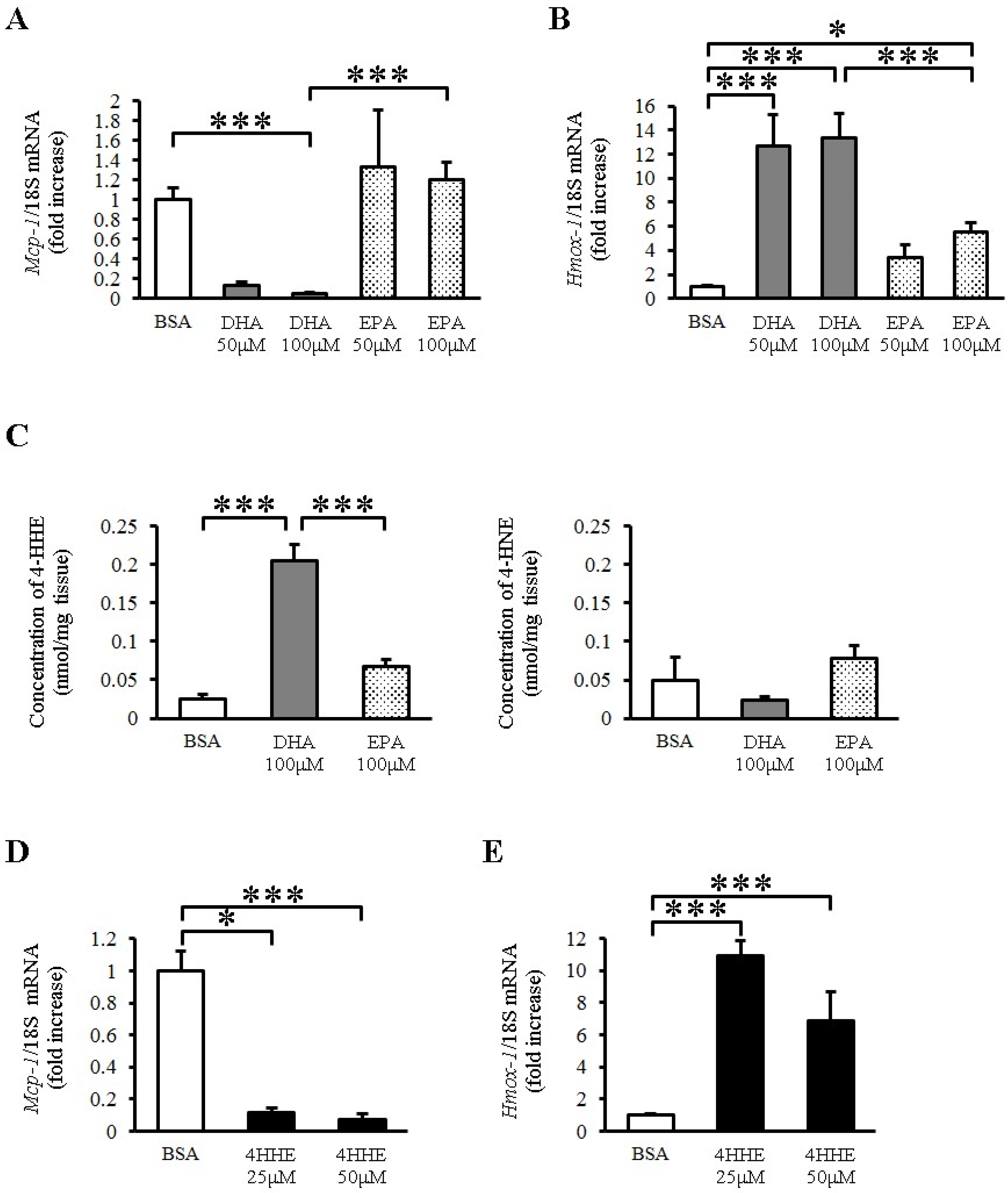 There were some limitations in this study. First, we could not identify the molecular mechanism of the DHA-induced Mcp-1 decrease in artery strips, although our data suggest that 4-HHE-induced Nrf2 activation may play a role. Second, the 4-HHE content measured was free 4-HHE. Because 4-HHE generates 4-HHE adducts—especially with glutathione—the total 4-HHE content in the tissues may be higher. We incubated VSMCs with 4-HHE at 25 μM based on its ability to stimulate Hmox1. Third, the clinical significance of the DHA-induced Mcp-1 expression is still not clear.