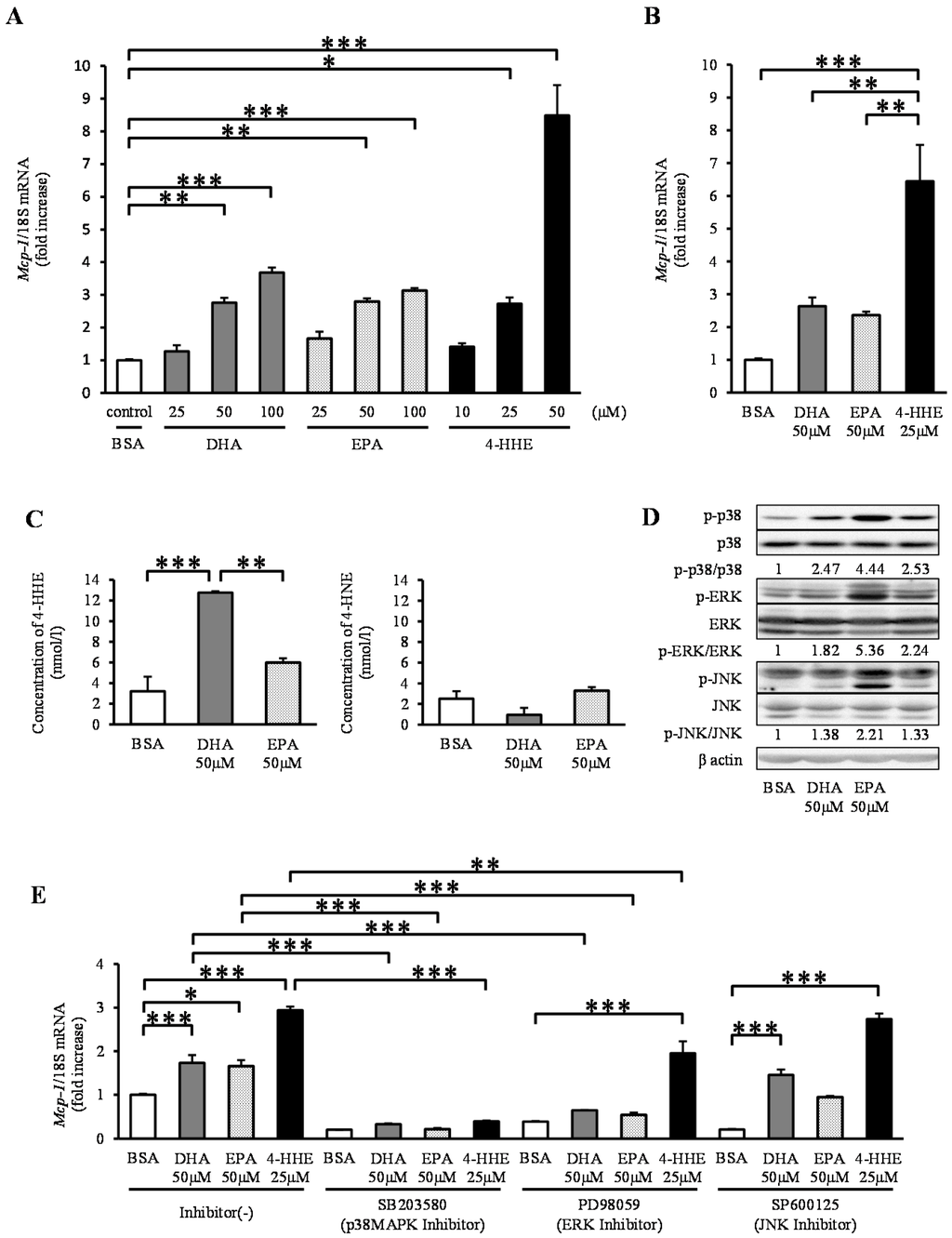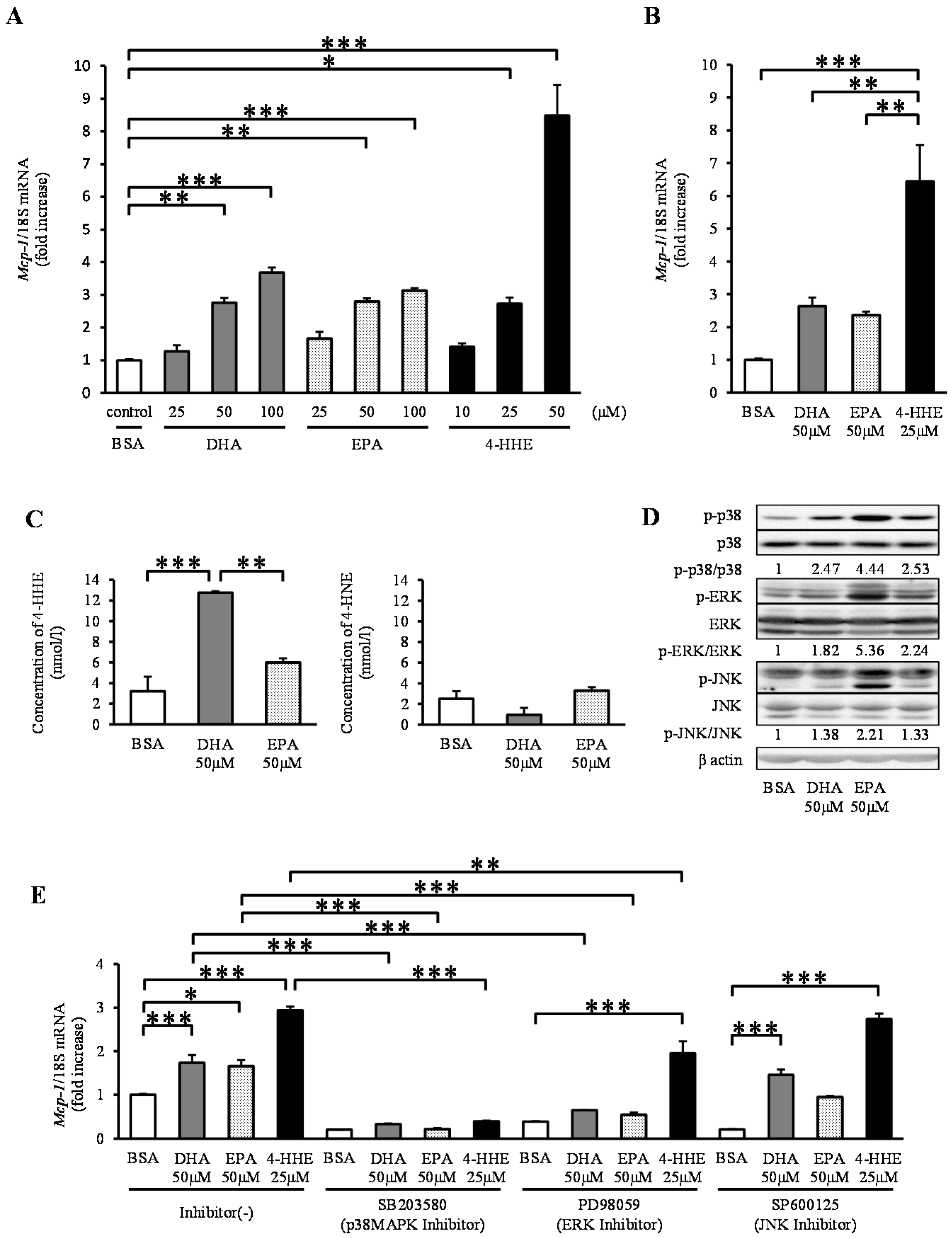 DHA, EPA, and 4-HHE induce Mcp-1 expression through the p38 mitogen-activated protein kinase (MAPK) pathway in VSMCs. VSMCs (Passage 4–12) were treated with the indicated reagent for 6 h (A). (B) Primary vessels and vascular smooth muscle cells (VSMCs) (Passage 1) were treated with BSA, DHA (50 μM), EPA (50 μM) or 4-HHE (25 μM) for 6 h. Relative mRNA expression of Mcp-1 was quantitated using RT-qPCR. The results were normalized against 18S rRNA and expressed as fold increase over control. (C) 4-HHE and 4-HNE content in VSMCs were measured using LC-MS/MS. (D) p38, ERK, JNK and their phosphorylated forms, and β-actin were determined by Western blotting. DHA (50 μM), EPA (50 μM) or 4-HHE (25 μM) were added for 10 min. (E) Pretreatment with p38 kinase inhibitor (SB203580; 10 μM), ERK inhibitor (PD98059; 25 μM) or JNK inhibitor (SP600125; 10 μM) was performed for 30 min before BSA, DHA, EPA or 4-HHE incubation. The results were normalized against 18S rRNA and expressed as fold increase over corresponding control. (A) Values represent the mean ± SE of four independent experiments (n = 9); (B) a single experiment (n = 3); (C) a single experiment (n = 3); or (E) three independent experiments (n = 3–9). * P < 0.05, ** P < 0.01, *** P < 0.001, compared with corresponding control.