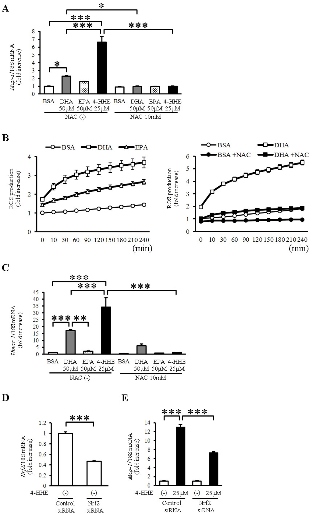 To evaluate Nrf2 activation by DHA and 4-HHE, we examined the mRNA expression of Hmox1, a target of Nrf2, in VSMCs. We found that DHA and 4-HHE stimulated the expression of Hmox1 mRNA in VSMCs, and that NAC inhibited the DHA- and 4-HHE-induced Hmox-1 expression (Figure 3C). As expected, the 4-HHE-induced Mcp-1 expression was decreased by siRNA against Nrf2 (Figure 3D,E).