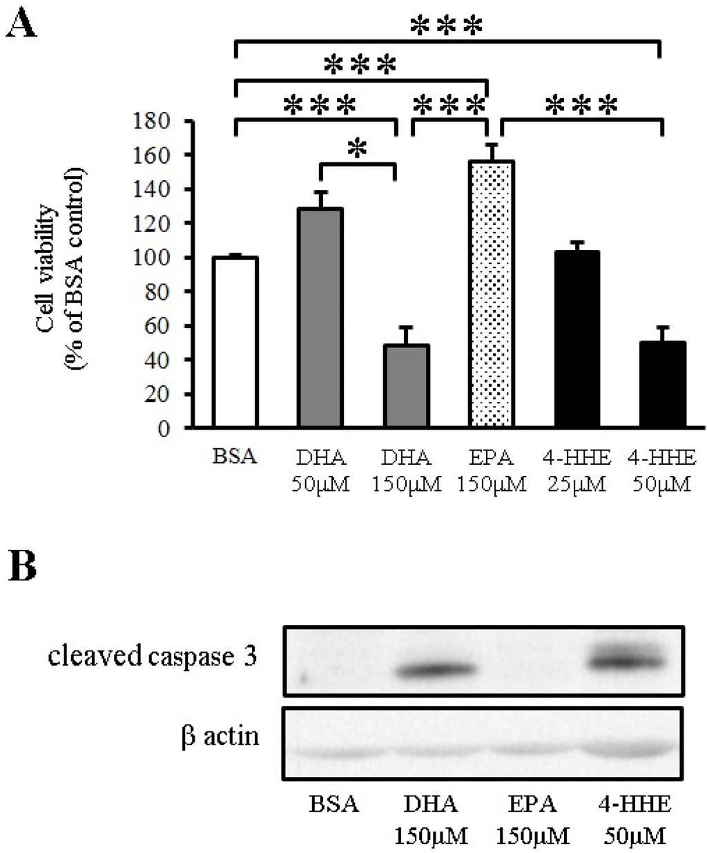 Dulbecco’s Modified Eagle’s Medium (DMEM) and fetal bovine serum (FBS) were obtained from Life Technologies (Grand Island, NY, USA). EPA, DHA, and 4-HHE were purchased from Cayman (Ann Arbor, MI, USA). The MTT assay kit, anti-β-actin (A5316) antibody and N-acetyl-l-cysteine were purchased from Sigma-Aldrich (St. Louis, MO, USA). Fatty acid-free bovine serum albumin (BSA) was purchased from Nacalai Tesque (Kyoto, Japan). Anti-p38 (#9112), anti-phospho-p38 (#9211), anti-ERK1/2 (#9102), anti-phospho-ERK1/2 (#9106), anti-JNK (#9252), anti-phospho-JNK (#9251), and anti-caspase-3 (#9661) antibodies were purchased from Cell Signaling (Danvers, MA, USA). Horseradish peroxidase-linked anti-mouse and anti-rabbit antibodies were purchased from Amersham Biosciences Corp. (Piscataway, NJ, USA). 2′7′-Dichlorodihydrofluorescein diacetate (H2DCFDA) and small interfering RNA (SiRNA) reagents were purchased from Life Technologies (Tokyo, Japan). SB203580, PD98059 and SP600125 were purchased from Calbiochem (Cambridge, UK).