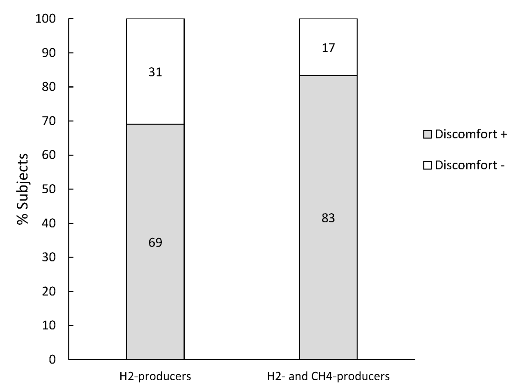 H2-producers reported significantly more discomfort compared to patients that produced no H2 (Chi Square, p < 0.001) (Figure 3).Within the group of subjects that only produced H2, H2-concentration was significantly higher for subjects that reported symptoms compared to subjects that did not experience symptoms (M-W, p = 0.002) (Table 2).