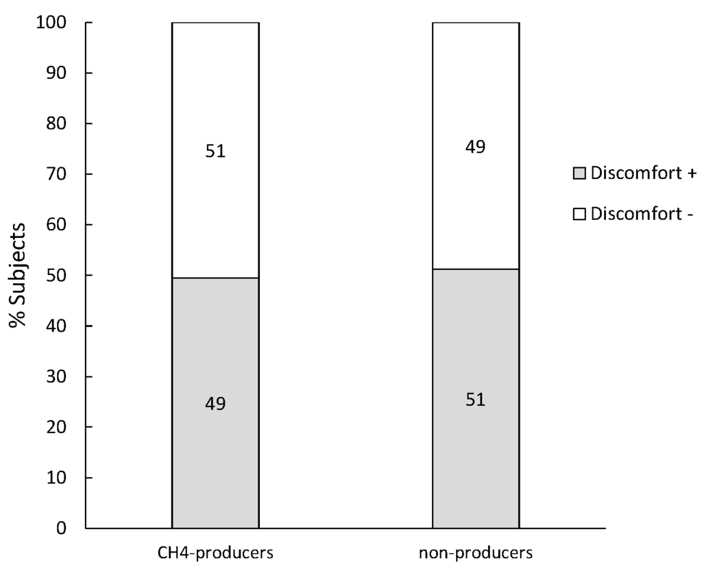 Of the 599 subjects with normal lactose digestion, 97 (16%) produced CH4 (Table 4). Remarkably, about half of these subjects reported discomfort, irrespective of whether they produced methane or not (Figure 5).