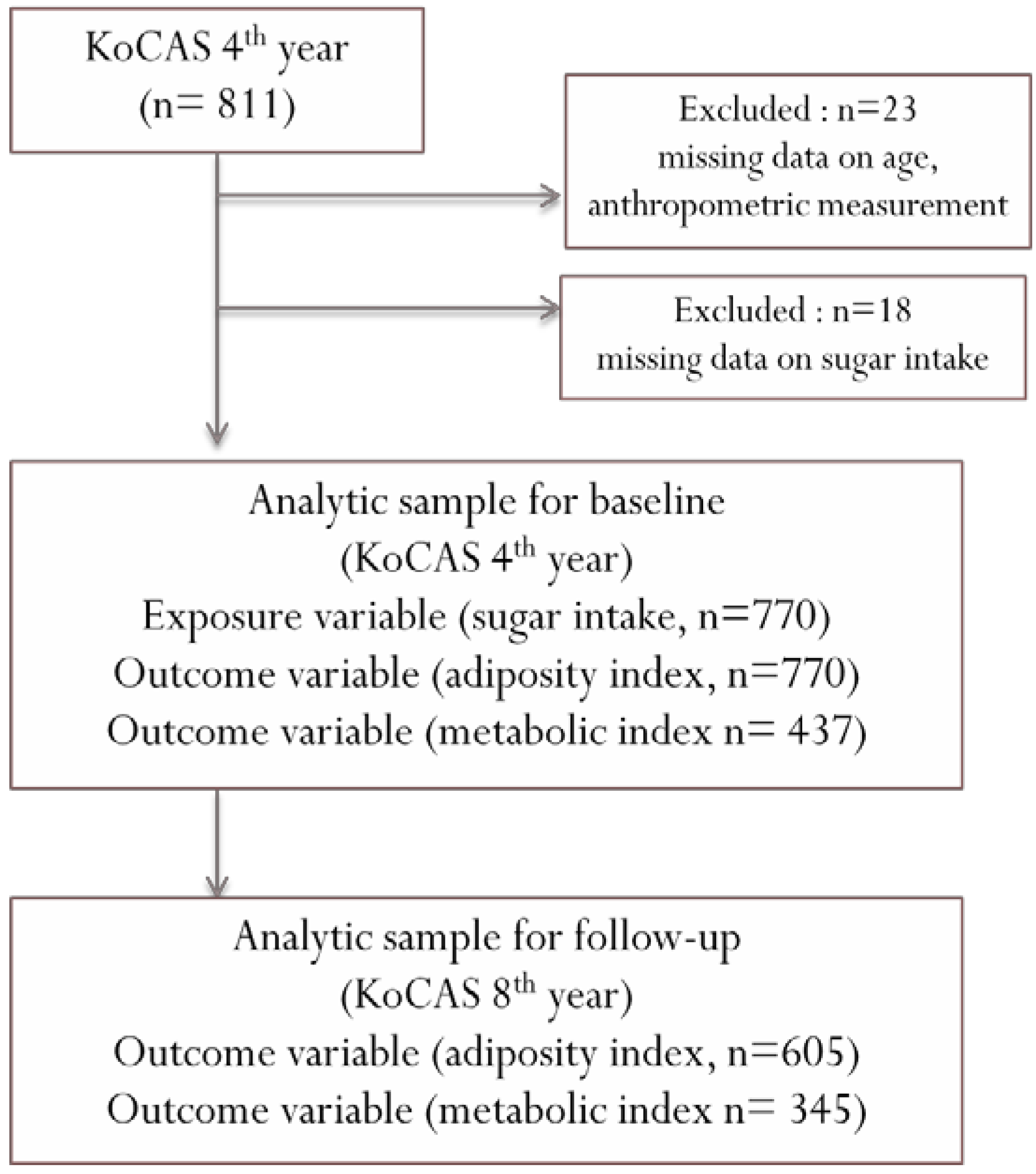 APA StyleHur, Y.-I., Park, H., Kang, J.-H., Lee, H.-A., Song, H. J., Lee, H.-J., & Kim, O.-H. (2016). Associations between Sugar Intake from Different Food Sources and Adiposity or Cardio-Metabolic Risk in Childhood and Adolescence: The Korean Child–Adolescent Cohort Study. Nutrients, 8(1), 20. https://doi.org/10.3390/nu8010020