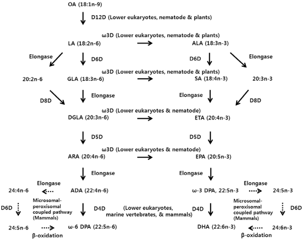 N/A: not applicable; D4D: delta-4 desaturase; D5D: delta-5 desaturase; D6D: delta-6 desaturase; D8D: delta-8 desaturase; D9D: delta-9 desaturase; D12D: delta-12 desaturase; D15D: delta-15 desaturase; ω3D: omega-3 desaturase.