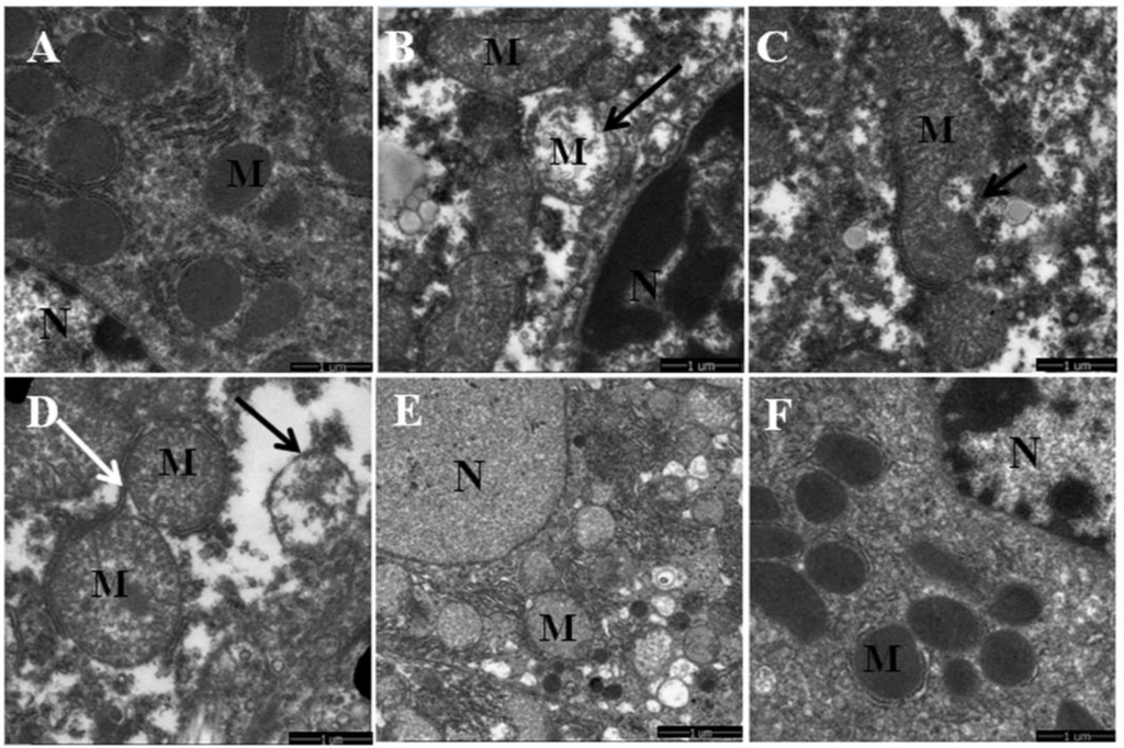 The effects of quercetin on the mitochondrial ultrastructural changes in livers of mice fed with ethanol. (A,F) normal and quercetin control groups (Ct, Qu); (B–D) ethanol group (Et); (E) quercetin and ethanol groups (Qu + Et); M, mitochondria; N, nucleus of hepatocyte.