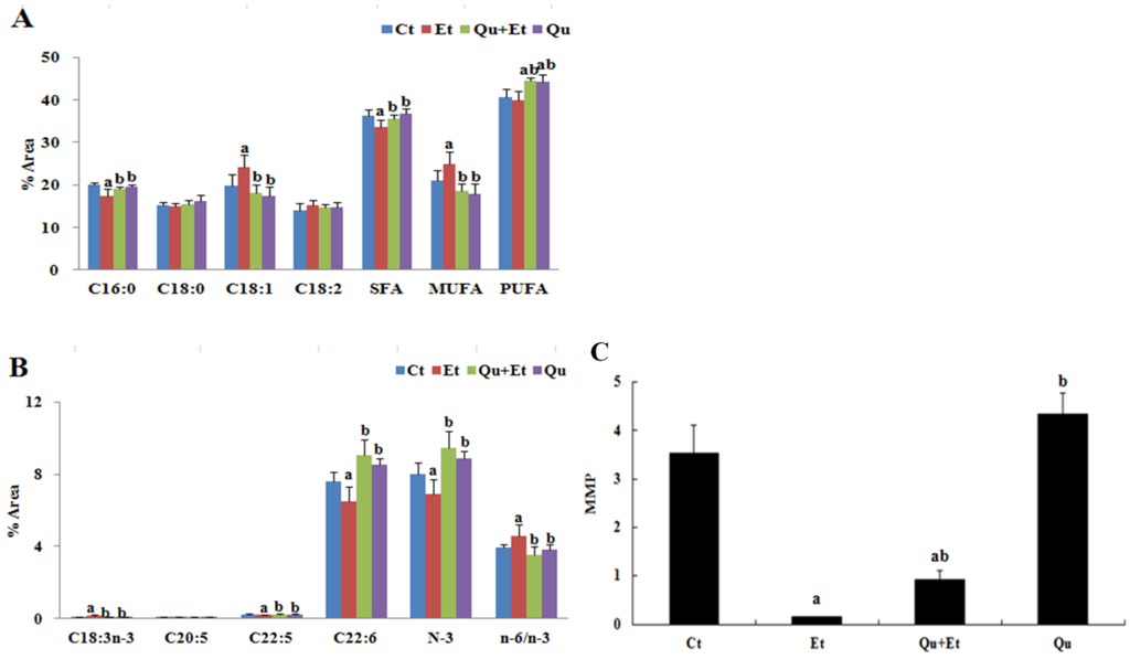 Effects of quercetin on the mitochondrial membrane lipid composition and membrane potential in livers of mice fed with ethanol. (A) The levels of C16:0, C18:0, C18:1, C18:2, SFA (given by C12:0 + C14:0 + C16:0 + C18:0 + C20:0 + C22:0 + C24:0), MUFA (given by C14:1 + C16:1 + C18:1 + C20:1 + C22:1 + C24:1) and PUFA (given by C18:2 + C18:3n-6 + C18:3n-3 + C20:2 + C20:3 + C20:4 + C20:5 + C22:4 + C22:5 + C22:6); (B) the levels of C18:3, C20:5, C22:5, C22:6, n-3PUFA (given by C18:3 + C20:5 + C22:5 + C22:6) and the ratio of n-6/n-3 (given by C18:2n-6 + C20:4n-6 + C22:4n-6 to C18:3n-3 + C20:5n-3 + C22:5n-3 + C22:6n-3); (C) the mitochondrial membrane potential (MMP). The levels of fatty acids were expressed as the percent area of total fatty acids. Results are expressed as the mean ± SD. A significant difference (p < 0.05) is identified by different letters: a, vs. the control group (Ct); b, vs. the ethanol group (Et).