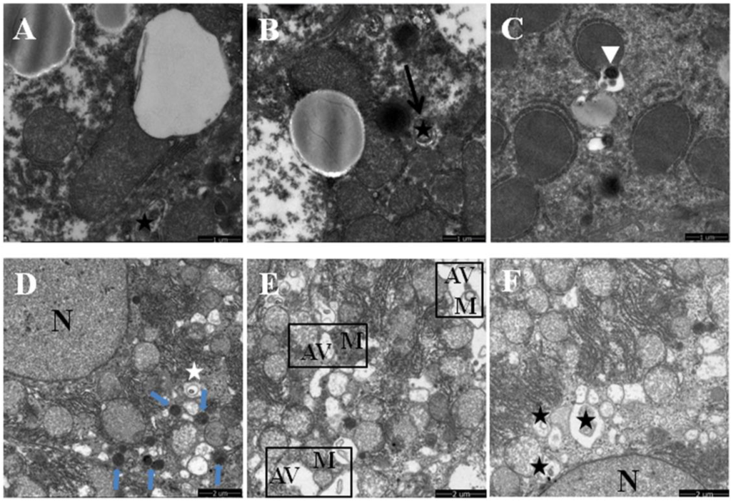 Effects of quercetin on the mitophagy by transmission electron microscopy in livers of mice fed with ethanol. (A–C) Ethanol group (Et); (D–F) quercetin and ethanol groups (Qu + Et); the black star in (A,B,E,F) demonstrates the early autophagic vacuoles (mitophagosomes); the white triangle in (C) shows the late autophagic vacuoles (autolysosomes); the short blue arrow in (D) marks lysosomes; M, mitochondria; N, nucleus of hepatocyte.