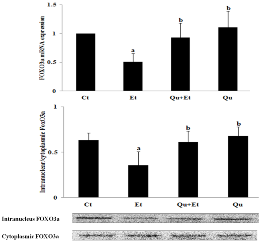 Effects of quercetin on the expression of FoxO3a in livers of mice fed with ethanol. A significant difference (p < 0.05) is identified by different letters. Hepatic mRNA expression of FoxO3a was measured by qRT-PCR (A); Western blotting was used to determine protein levels of intranuclear and cytoplasmic FoxO3a (B). Results are expressed as the mean ± SD (six independent experiments for qRT-PCR, three for Western blotting). a, vs. the control group (Ct); b, vs. the ethanol group (Et).