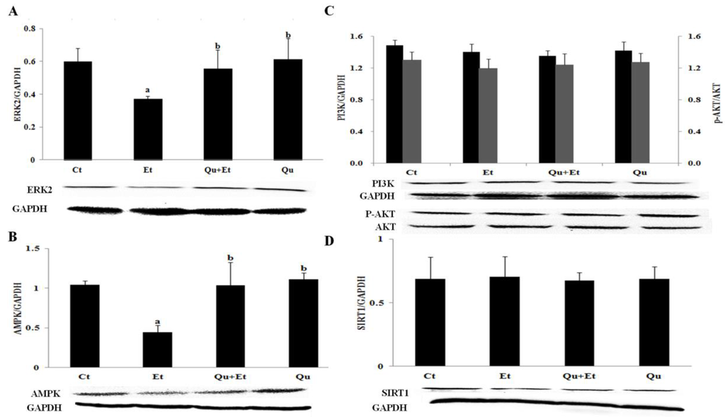 Effects of quercetin on the expression of ERK2 (A), AMPK (B), PI3K, p-AKT/AKT (C) and SIRT1 (D) in livers of mice fed with ethanol. Results are expressed as the mean ± SD (three independent experiments for Western blotting). A significant difference (p < 0.05) is identified by different letters: a, vs. the control group (Ct); b, vs. the ethanol group (Et).