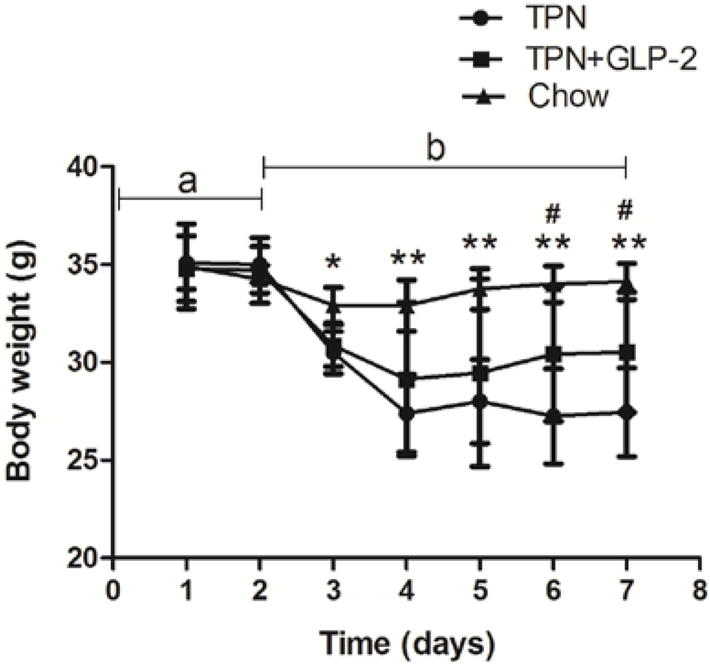 Daily body weights in all mice, a: 2-day surgical recovery, b: 5-day experimental period, * p < 0.05: TPN vs. control, ** p < 0.001: TPN vs. control, # p < 0.05:TPN + GLP-2 vs. TPN.