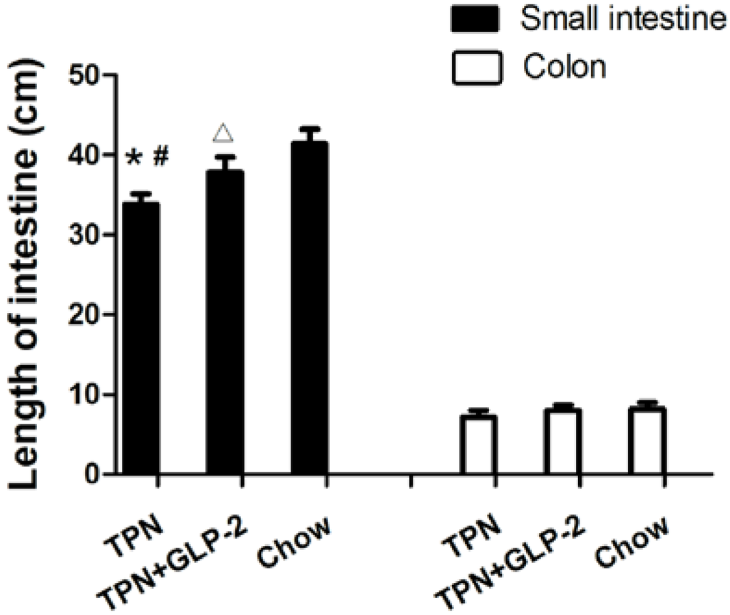 Influence of TPN administration and GLP-2 supplementation on the intestinal length. * p < 0.05 vs. TPN+GLP-2, # p < 0.001 vs. control, ∆ p < 0.05 vs. Control.