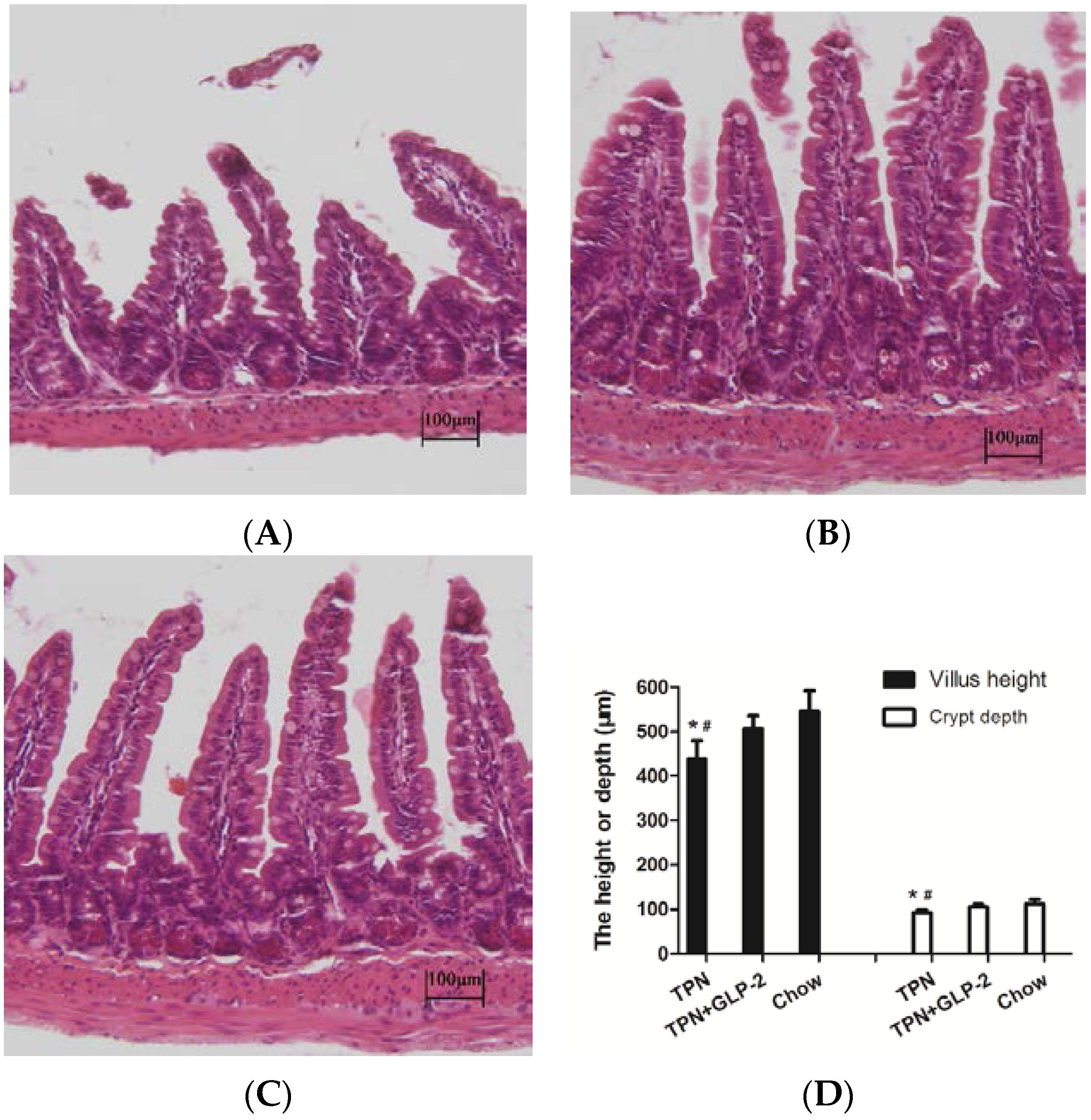 Representative H & E-stained histology image from the TPN group (A); TPN + GLP-2 group (B); and control group (C); (H & E staining; original magnifications, ×200) (D). Villus height and crypt depth in the TPN, TPN + GLP-2, and control groups are shown.* p < 0.05 vs. TPN + GLP-2, # p < 0.001 vs. Control.