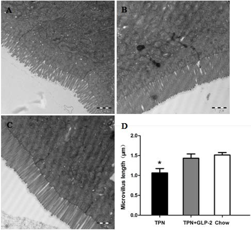 Representative photomicrographs of intestinal microvillus from the TPN group (A); TPN + GLP-2 group (B); and control group (C) (photomicrographs; original magnifications, ×20,000; bar = 1 µm). (D) Effect of GLP-2 treatment for five days on microvillus length (mean ± SD), * p < 0.05 vs. TPN + GLP-2 and control.